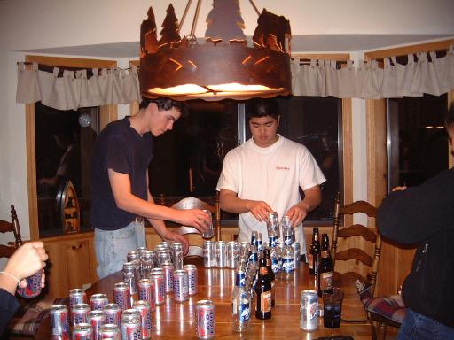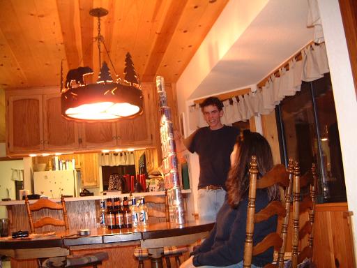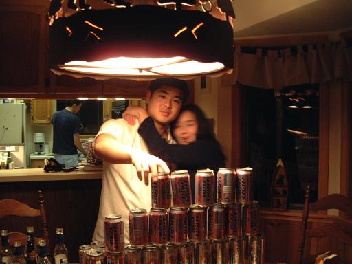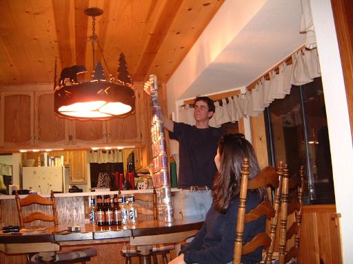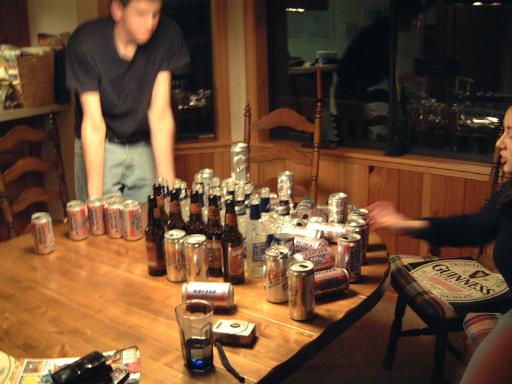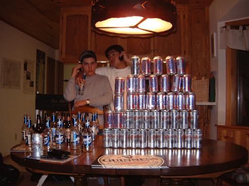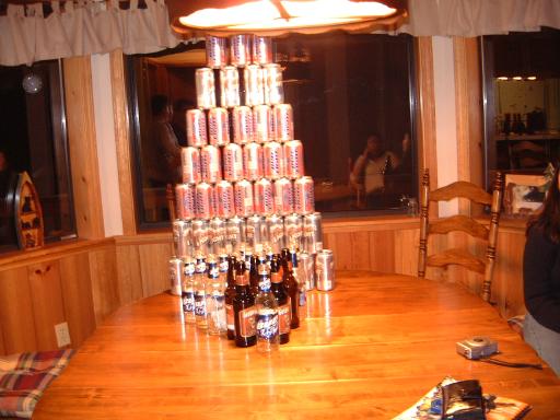My goal of this trip (besides the insider one) was to make a beeramid with 100+ beers. This didn't really work, since we only had 71 (I brought 23 (14 Bud Ice, 6 Gordon Biersch and 3 Bud Lights), 18 Bud Lights were tapped the first night, and 30 Coors Light were tapped the third night) beers, and 20 were bottles. Shit, I need to plan better and get all cans, all the same kind. We tried making a 3D tower first, ahh no, actually Melissa tried to make a straight one, but that shit fell down. Well anyways, the 3D tower didn't work because of the different sized cans.