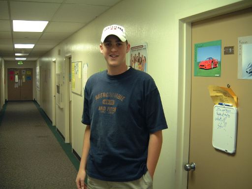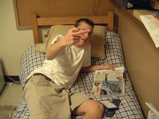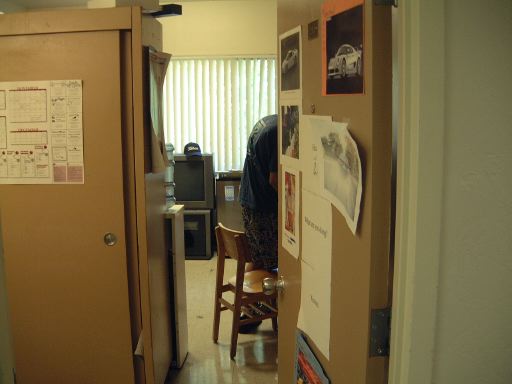 Let's start off with my room. It's in the middle of the hall. I like to put signs up on my door, but people seem to like to write "cock," "gay" and other shit like that on the signs. It makes me uncomfortable. You see my roommate in the background? Are you excited to see him?