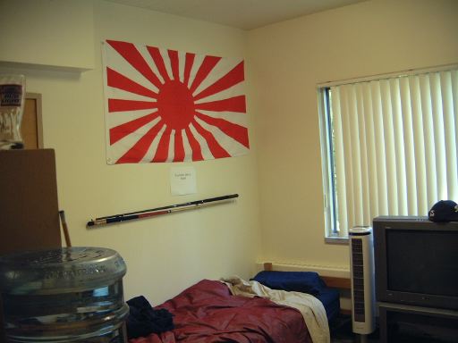 Over my bed there is another Japanese flag. Under it there is a sign that says Yes bitch, this is Japan. I forget who, but some fool came into my room and asked if it was the Taiwanese flag. Dumbass. You like my pool cues? The top one is stunna, it looks like carbon fiber but it is graphite. It's a Cuetec Jump/Break cue. The bottom one is my Budweiser one. I love pool. However, the day I put the sticks up, they fell down. I attached the hooks by tape, since I'm not allowed to drill into the wall. And then when one hook fell off, I had to take out the other. And when I pulled it off the wall, it took out a big chunk. Not good.
