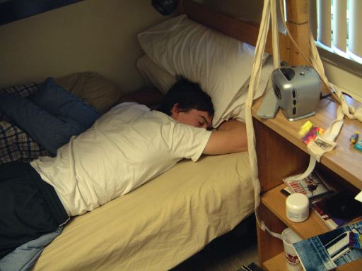 My TV, bed, fridge and fan. That bed is so uncomfortable. Like jail fool. I don't like sleeping right next to a wall. I am considering purchasing a queen size.