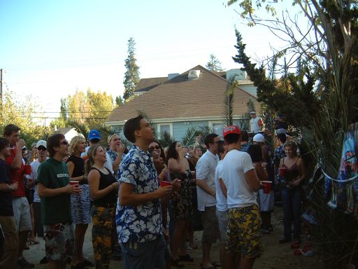 This is the party. There were many heads in the house. There were also DJs and dancing. It took place in the backyard.