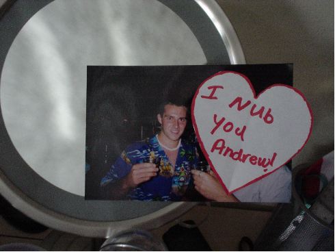 I come home one day to see this on my mirror located on my desk. Andrew is my roommate. Still, I was confused.