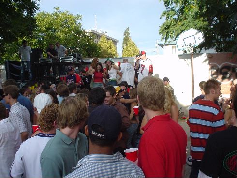 A day party. I had forgotten how hard it is to get beer at one of these things so I had run back to the house and get some beer for the Marquis. By the way this party was great they had these white rappers come and rap, with Erin dancing on stage. She is in the red.