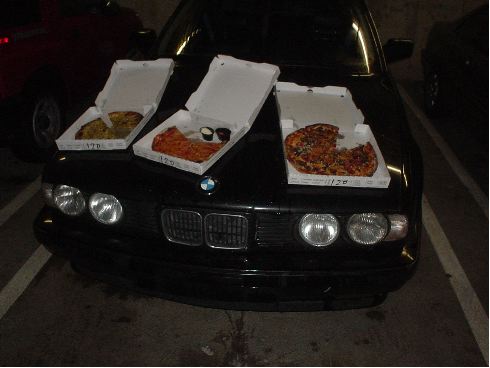 Ferd had a hot date with Serene and needed to get back to school with a quickness, so I called in an order to Amici's en route. However due to "policy" you can't call for a dine in like most pizzerias. So we had to eat on the hood of the 5 in a desolate garage.
